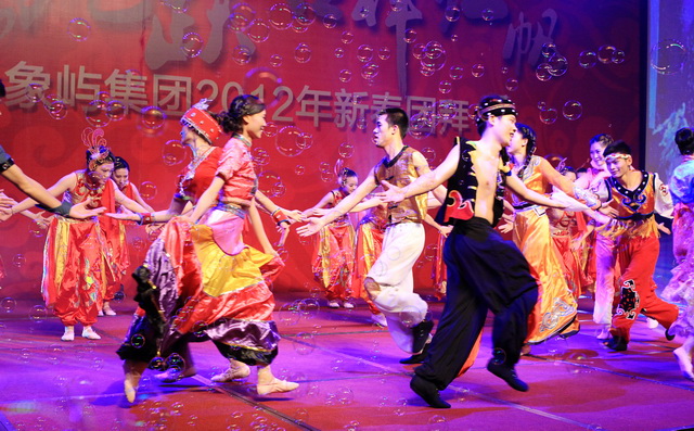團(tuán)拜會上,象嶼人自編自導(dǎo)自演的春晚節(jié)目盛大登場。象嶼建設(shè)集團(tuán)獻(xiàn)演的歡慶歌舞《盛世中華》,身著民族節(jié)慶服飾的姑娘小伙們熱情奔放,氣勢恢弘;象嶼股份火辣的阿拉伯舞《美麗的姑娘賽比古兒》驚艷全場,扭轉(zhuǎn),抖肩,甩胯,窈窕的姑娘們盡情地綻放著耀眼的青春;上海區(qū)域選送京劇《智斗》,叱咤上海灘的各位公司高管齊登戲臺,無論是司令還是阿慶嫂,范兒倍足,調(diào)兒倍正,十足個性演繹,引發(fā)臺下叫好不斷;集團(tuán)公司聯(lián)合象嶼資產(chǎn)、象嶼配送、象嶼碼頭、象嶼建設(shè)表演的歌舞聯(lián)唱《歲月如歌》,高中基三級同臺,老中青三代盡歡,不同風(fēng)格的歌舞串聯(lián),展現(xiàn)的是象嶼文化的包容與開創(chuàng);福建/南平象嶼公司逗趣的《小人舞》創(chuàng)意無限,傳神的表情映襯恰到好處的肢體動作,笑點(diǎn)不斷,而很難想象的是每個人物都由雙人搭配,紅幕后是團(tuán)隊配合的默契;速傳物流活潑優(yōu)美的新疆舞《掀起你的蓋頭來》充滿戲劇色彩,群舞韻律動感,對舞火花擦撞,多情的青年男女追尋著炙熱的愛情,也寓意著象嶼人勇于追求心中美好的向往。春晚在晨帆合唱團(tuán)歡快的《陽光進(jìn)行曲》中成功落下帷幕。團(tuán)拜會現(xiàn)場歡樂、祥和,晚宴期間穿插的抽獎活動,更讓驚喜的歡呼尖叫聲接連不斷,公司為辛勤一年的員工們準(zhǔn)備的豐厚大禮,掀起現(xiàn)場一次又一次的高潮。