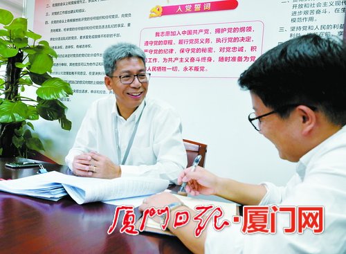 象嶼股份黨委副書(shū)記、副總經(jīng)理齊衛(wèi)東(左)跟員工探討項(xiàng)目落實(shí)情況。(《廈門(mén)日?qǐng)?bào)》記者 黃曉珍 攝)