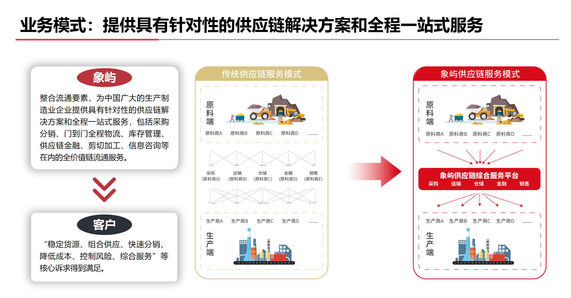 豐富多元、成熟穩(wěn)定的全球化業(yè)務(wù)渠道體系;覆蓋全國、連接海外的網(wǎng)絡(luò)化物流服務(wù)體系;正在構(gòu)建、初步成型的智能化信息科技體系;準(zhǔn)確識(shí)別、日趨完善的全面風(fēng)險(xiǎn)管控體系;市場化、專業(yè)化的供應(yīng)鏈服務(wù)團(tuán)隊(duì)。
