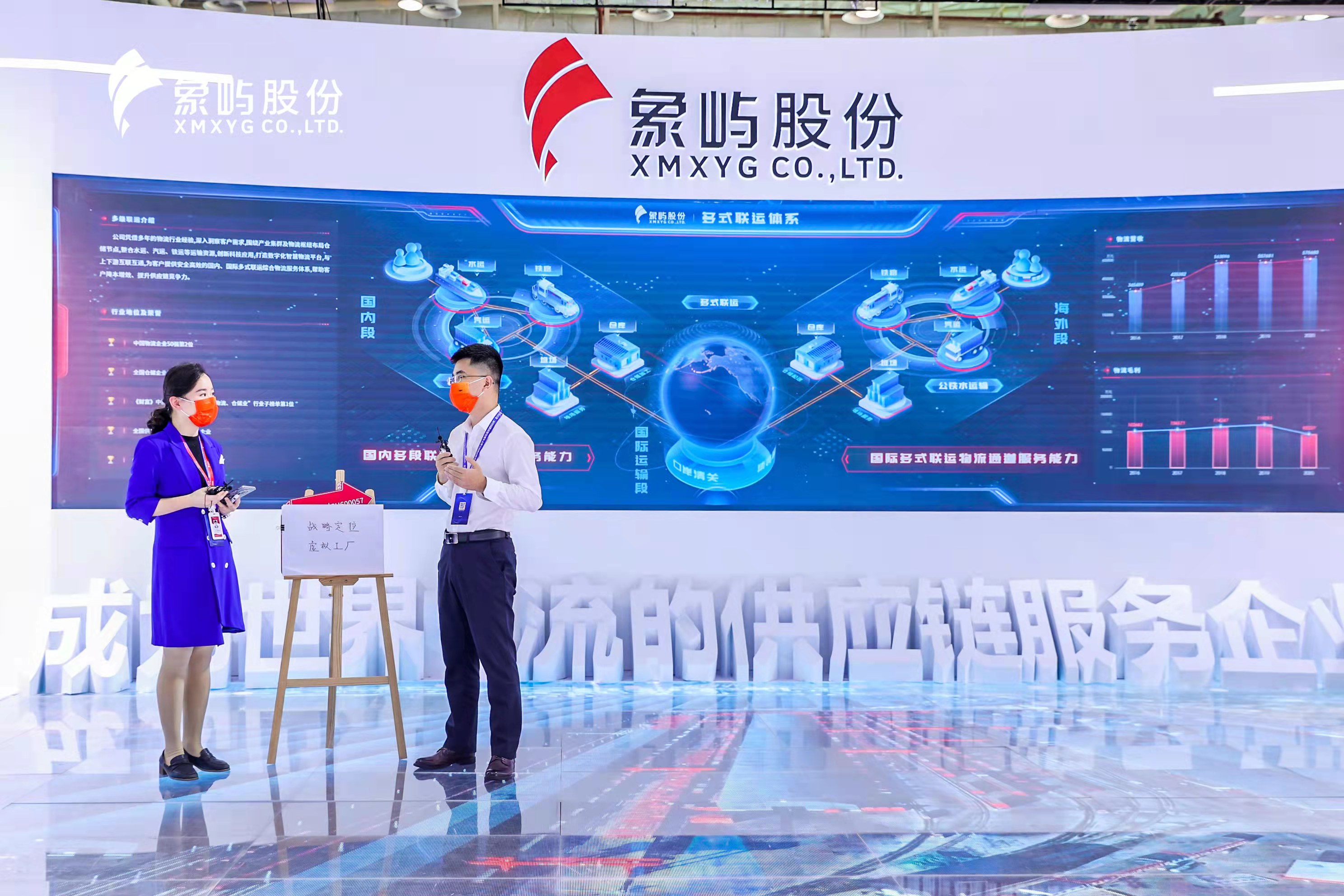 天屏地屏主屏三屏互動, 全景地屏展現(xiàn)了象嶼股份農(nóng)產(chǎn)品、能源化工、金屬礦產(chǎn)供應鏈板塊的業(yè)務亮點,通過東北象嶼糧倉、陜西場站、印尼不銹鋼冶煉項目等典型項目實景展示,進一步詮釋象嶼業(yè)務模式及國際化發(fā)展!