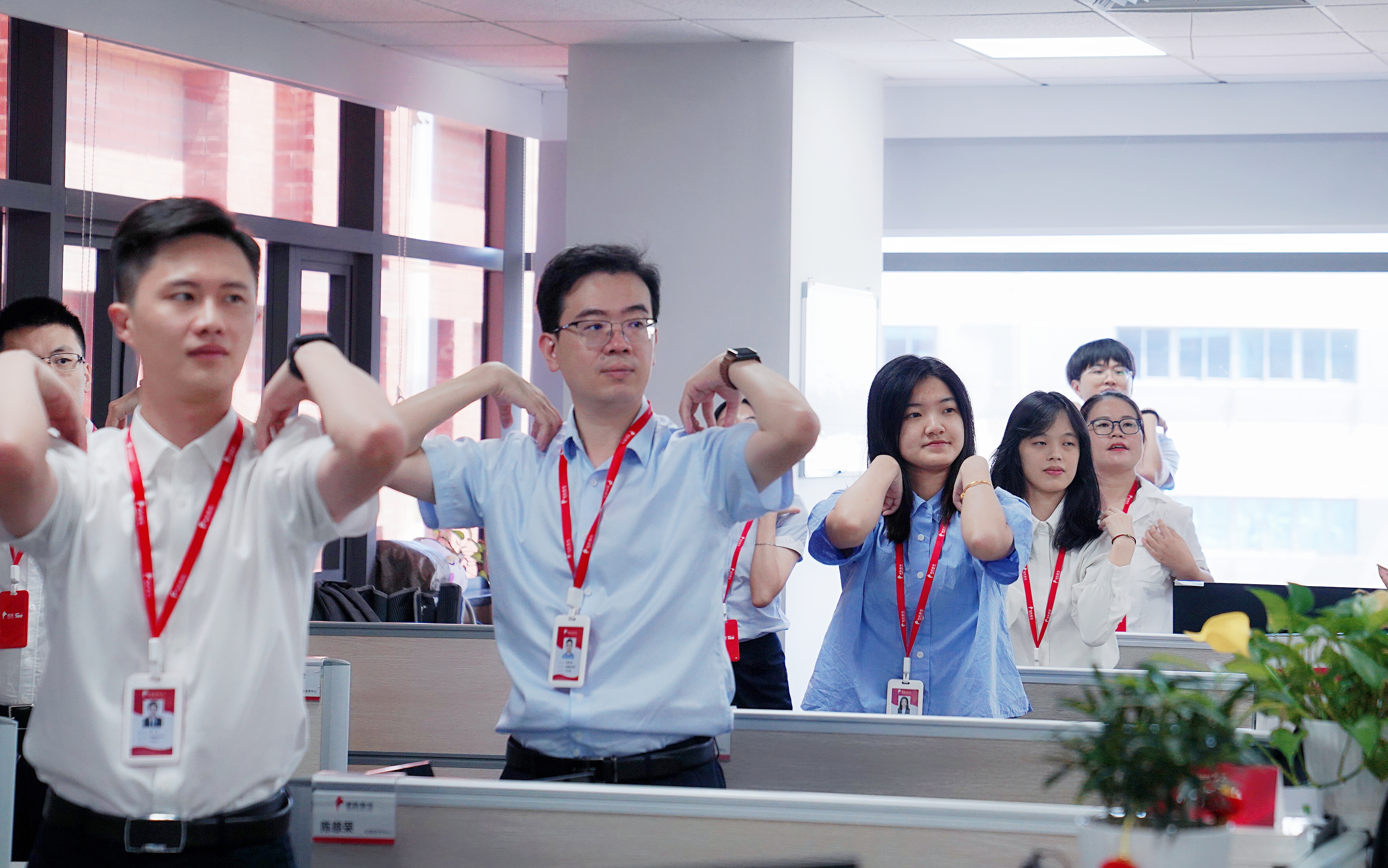 早上十點(diǎn)半,隨著律動(dòng)音樂(lè)的響起,大家紛紛從工位上起身,加入到了活力工間操隊(duì)伍中。一二三四,五六七八,二二三四,五六七八……頭部運(yùn)動(dòng)、體側(cè)運(yùn)動(dòng)、擴(kuò)胸運(yùn)動(dòng)、體轉(zhuǎn)運(yùn)動(dòng)……每一個(gè)節(jié)拍,每一個(gè)動(dòng)作,無(wú)不體現(xiàn)著象嶼人的朝氣蓬勃和積極向上!