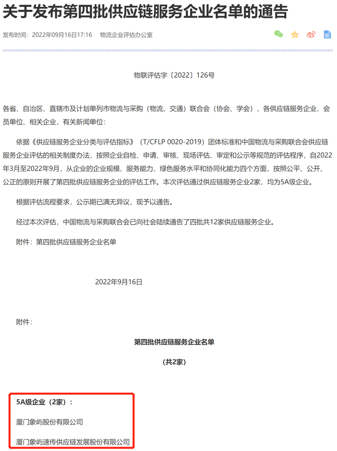近日,象嶼股份及旗下象嶼速傳通過“5A級(jí)供應(yīng)鏈服務(wù)企業(yè)”評(píng)估,這也是目前福建省僅有的2家通過該評(píng)估的企業(yè)。