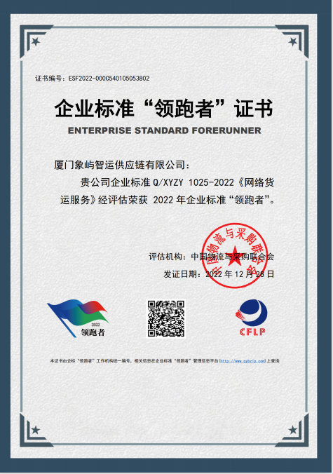 近日,“企業(yè)標(biāo)準(zhǔn)領(lǐng)跑者管理信息平臺(tái)”正式發(fā)布“物流服務(wù)”領(lǐng)域首批企業(yè)標(biāo)準(zhǔn)“領(lǐng)跑者”企業(yè)名單。象嶼股份旗下廈門象嶼智運(yùn)供應(yīng)鏈有限公司憑借高水平的網(wǎng)絡(luò)貨運(yùn)服務(wù)質(zhì)量,良好的服務(wù)信譽(yù)以及扎實(shí)的企業(yè)管理體系,榮膺首批網(wǎng)絡(luò)貨運(yùn)服務(wù)“領(lǐng)跑者”。